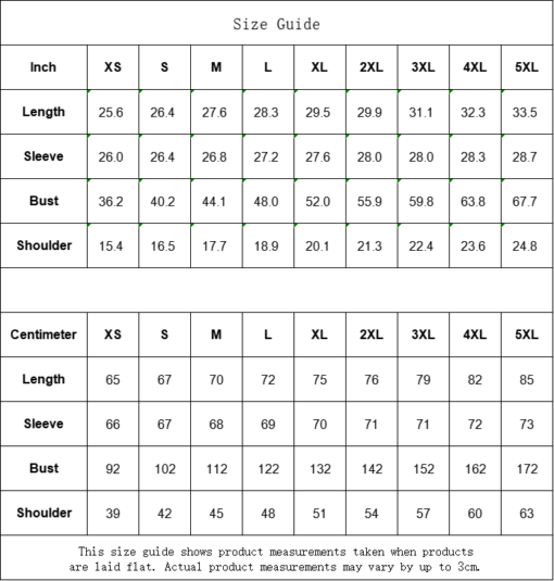 | Centimeter | XS | S | M | L | XL | 2XL | 3XL | 4XL | 5XL |